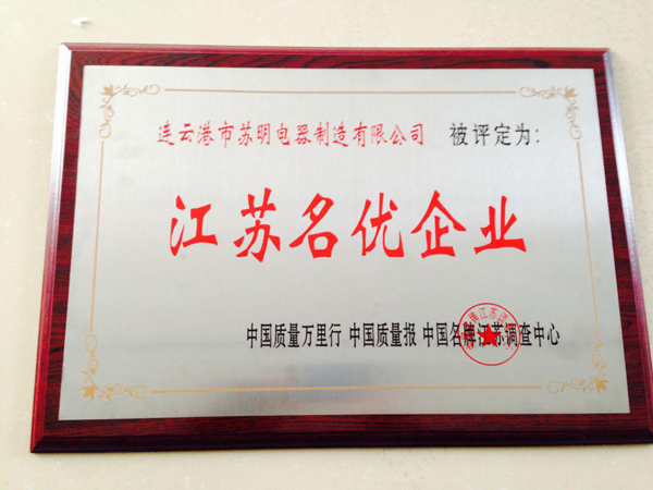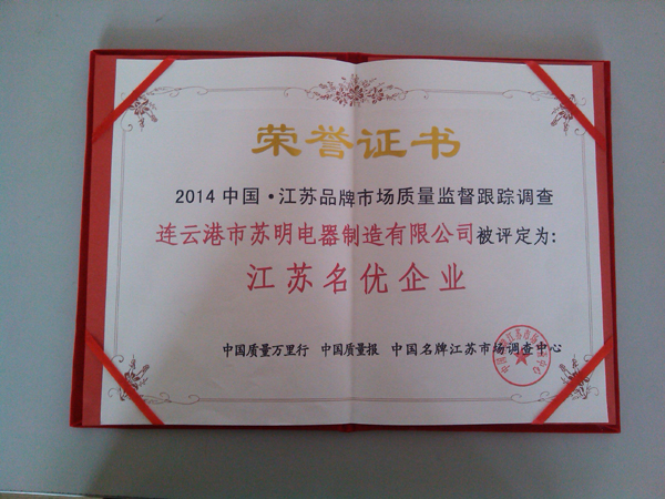 在2014年3.15到來(lái)之際,連云港市蘇明電器制造有限公司被中國.江蘇品牌市場(chǎng)質(zhì)量監督跟蹤調查中心評為 “江蘇名優(yōu)企業(yè)”。